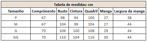 - Manga: Medido do ombro até o final da manga.
